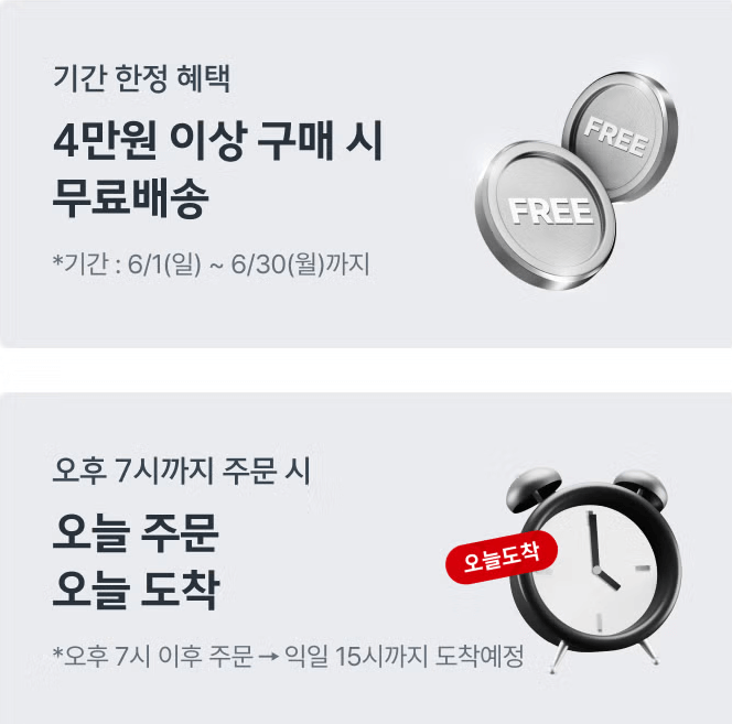 - ✔ 평일 오후 2시 이전 익일배송 도입 및 한진택배 이용