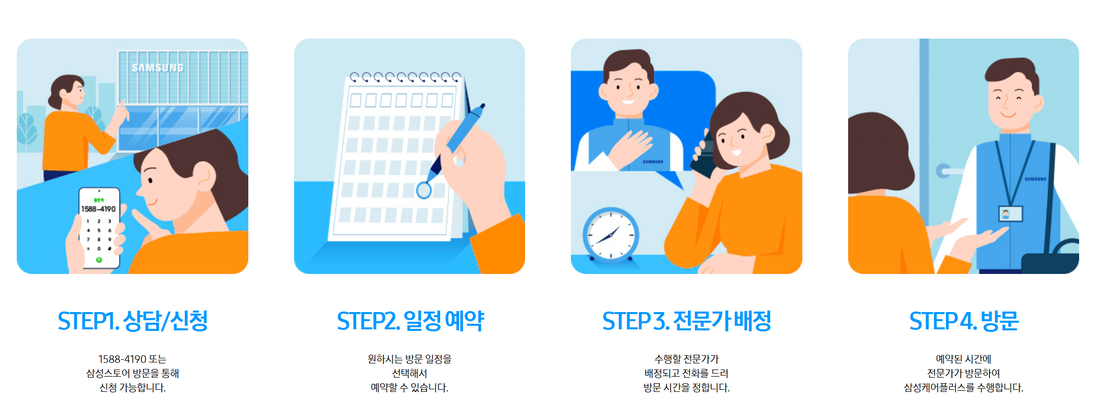| 예약 방법 | 삼성 홈페이지 또는 스마트싱스 앱 | 전화 또는 앱 통해 개별 연락 |