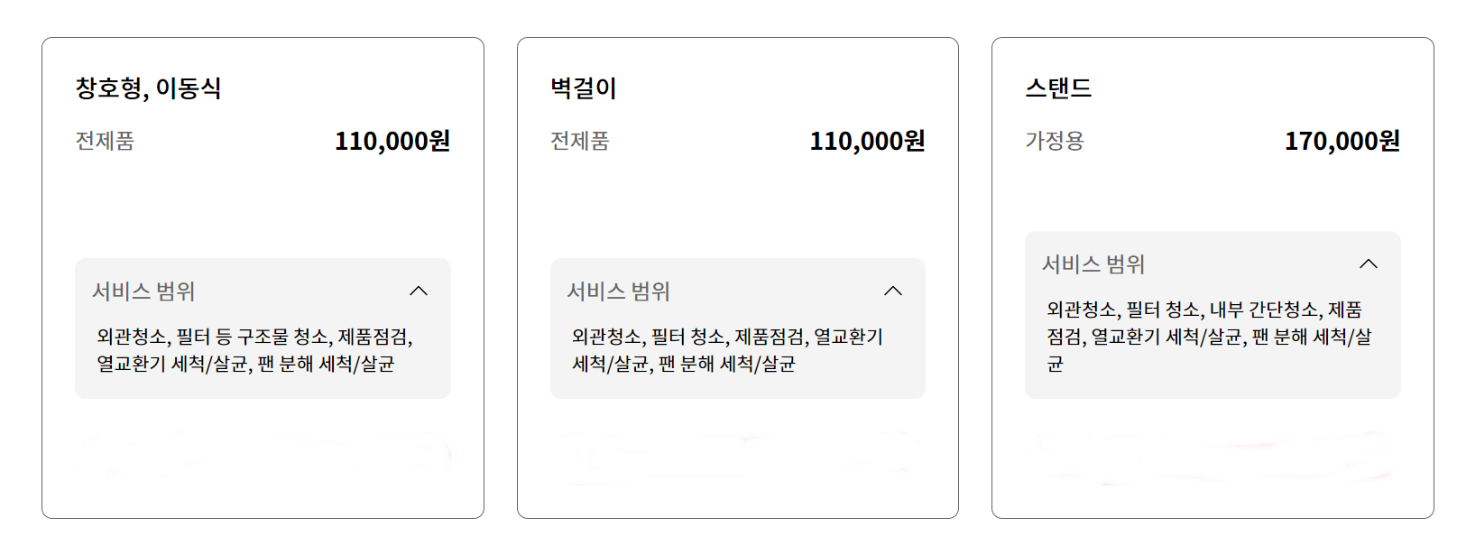 청소 비용은 벽걸이형 109,000원 스탠드형 171,000원, 천장형(가정용) 174,000원, 홈멀티(스탠드+벽걸이) 280,000원으로 진행하고 있습니다.