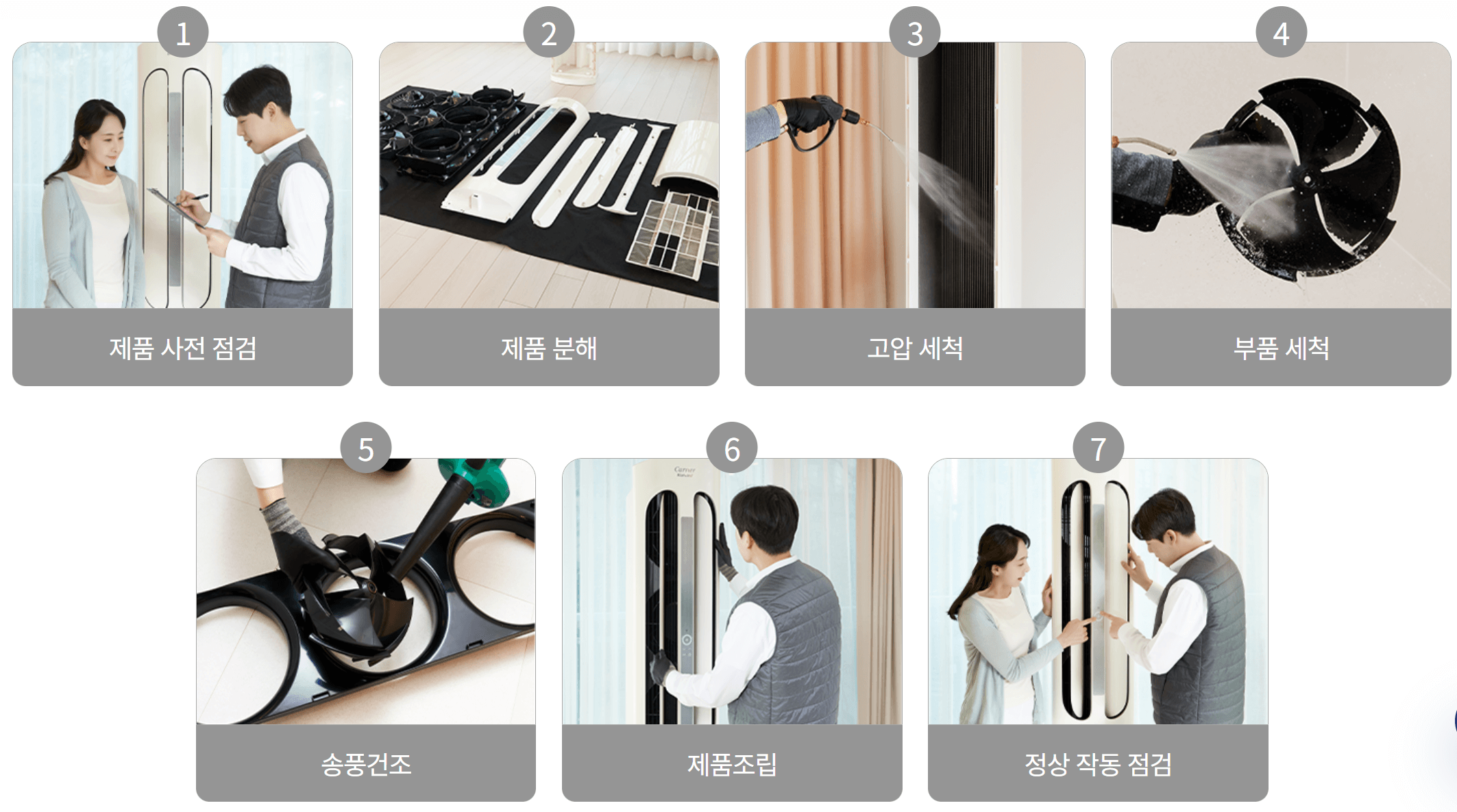 진행과정은 에어컨 점검> 제품분해> 열교환기 세척> 기구물세척> 건조, 살균> 조립, 외부청소 > 사후관리안내순으로 진행되고 있습니다