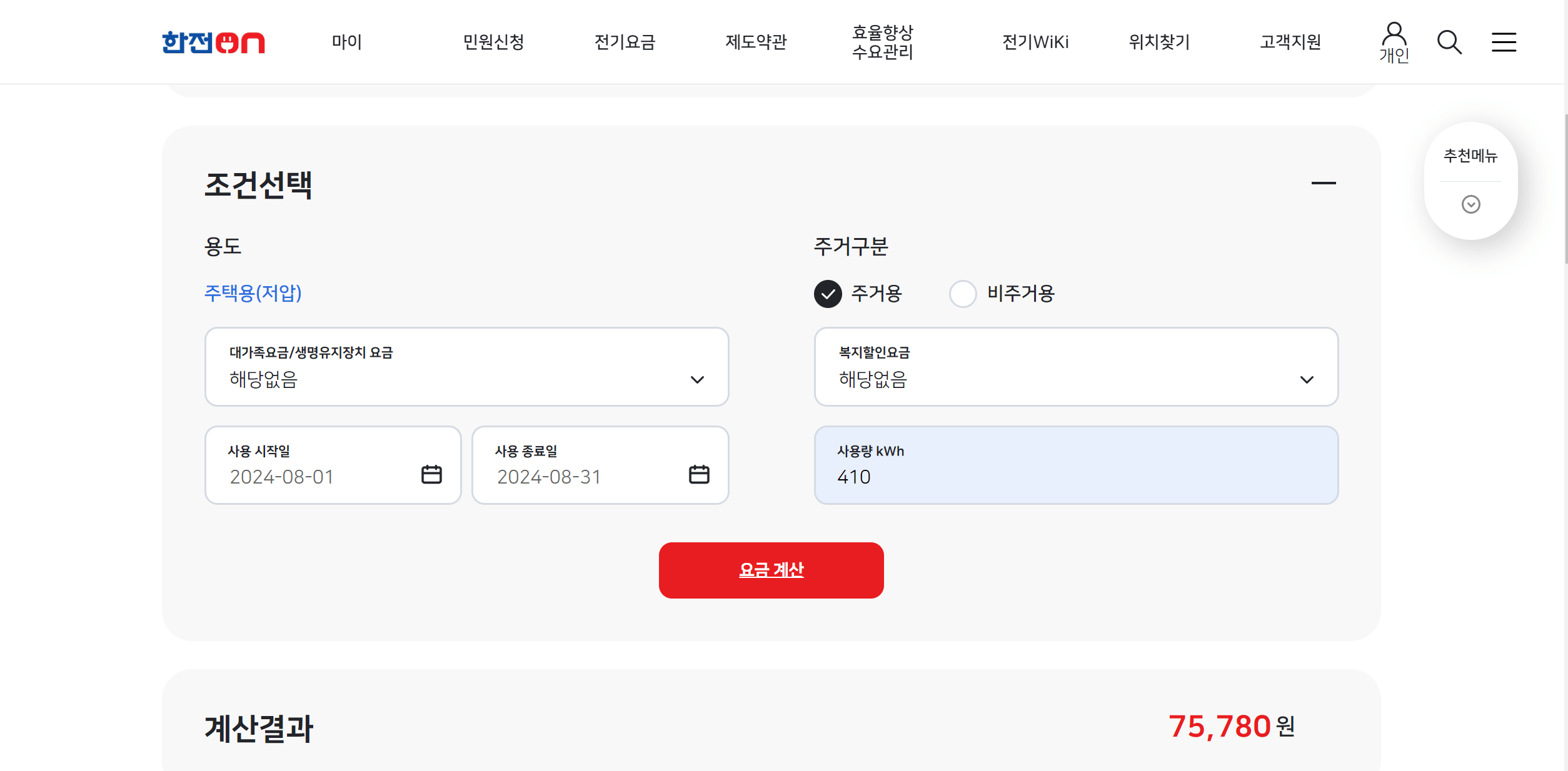 계약 종별 선택 > 사용기간 > 현재까지 사용량 입력> 요금 계산 클릭